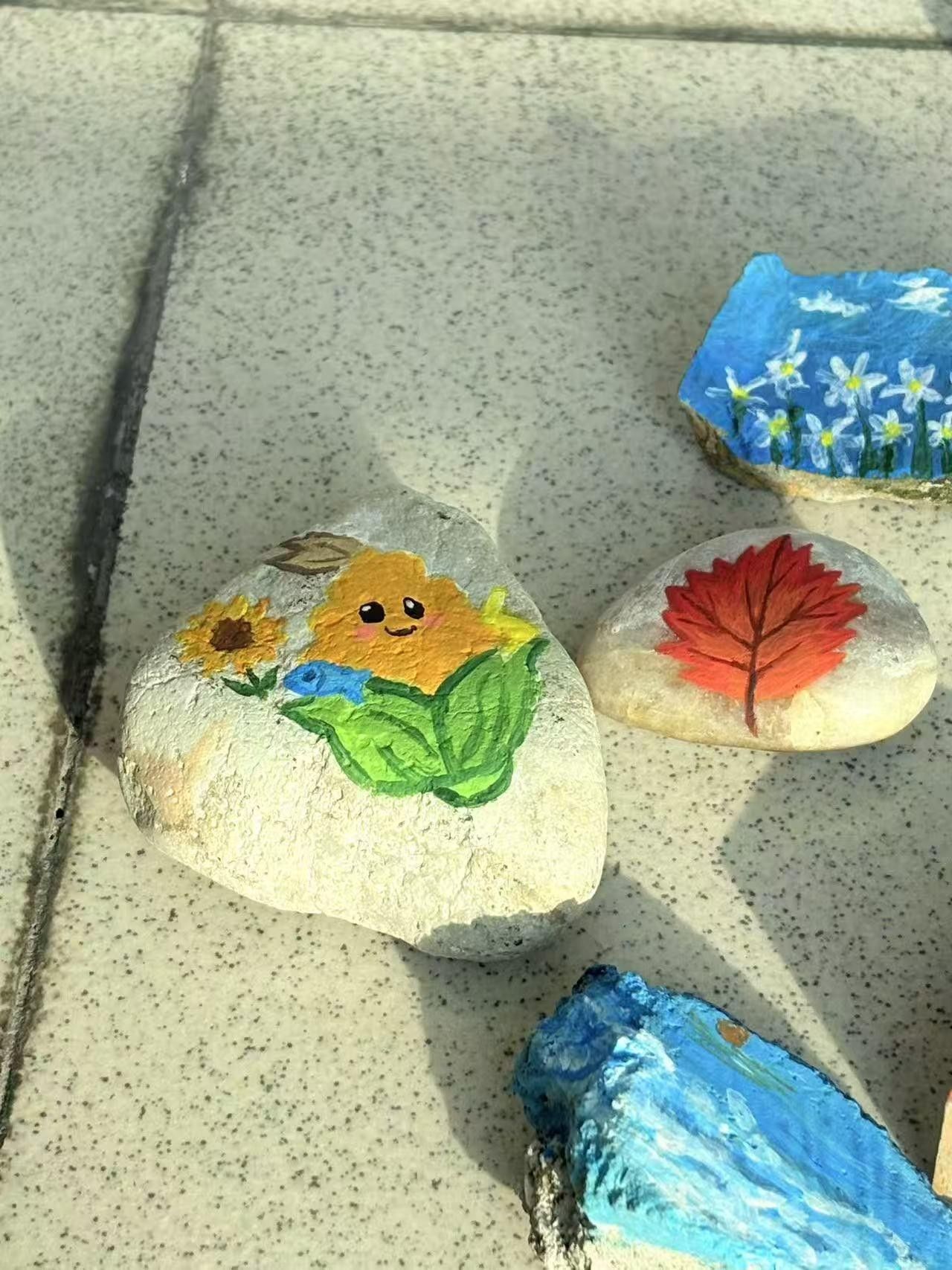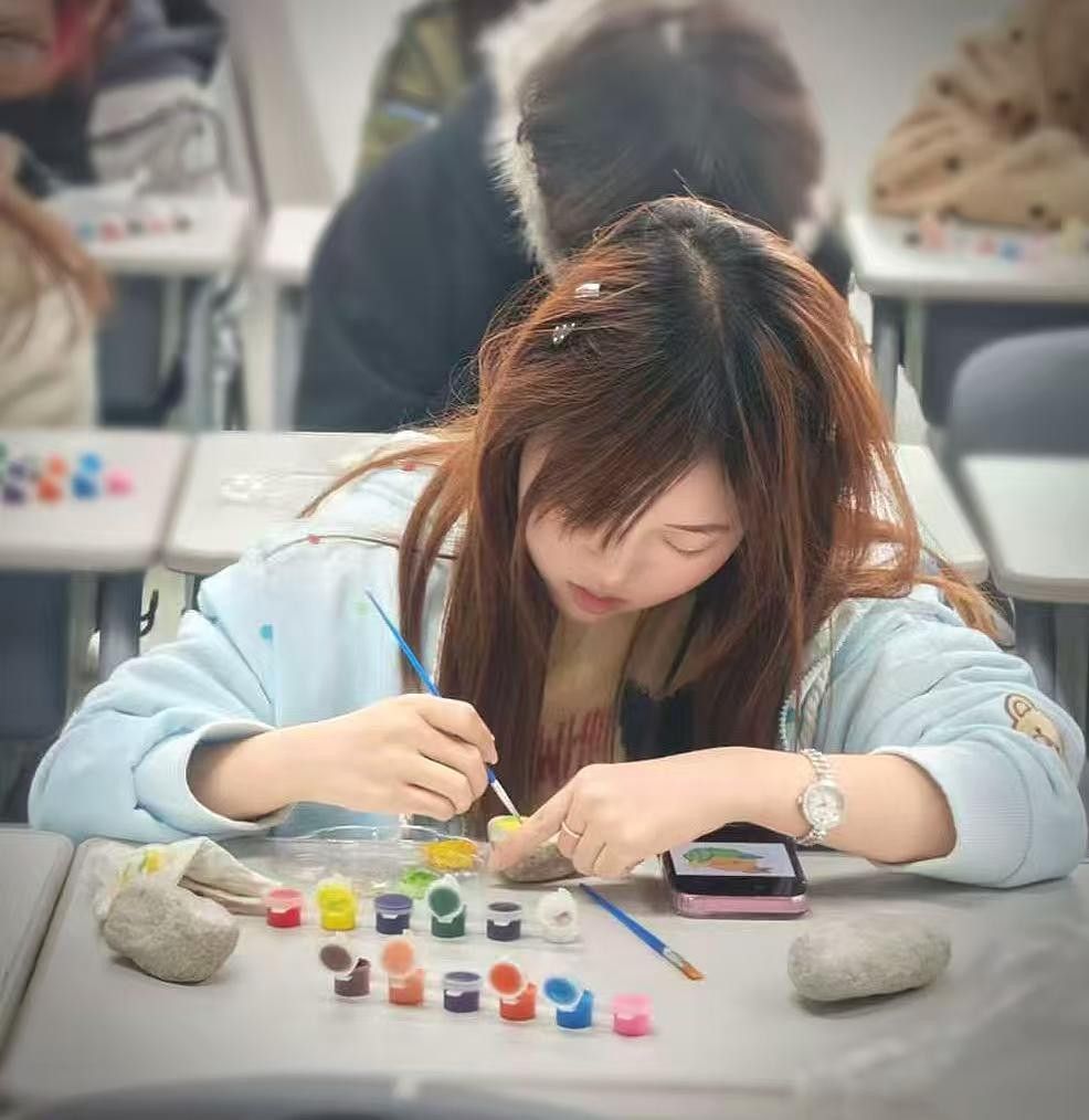 创作过程中,同学们或专注描绘,或轻声交流想法,现场洋溢着轻松愉悦的氛围。活动尾声,大家手持自己完成的石绘作品合影留念,彼此分享创作心得,在收获个人“小确幸”的同时,也真切感受到艺术创作带来的治愈与温暖。